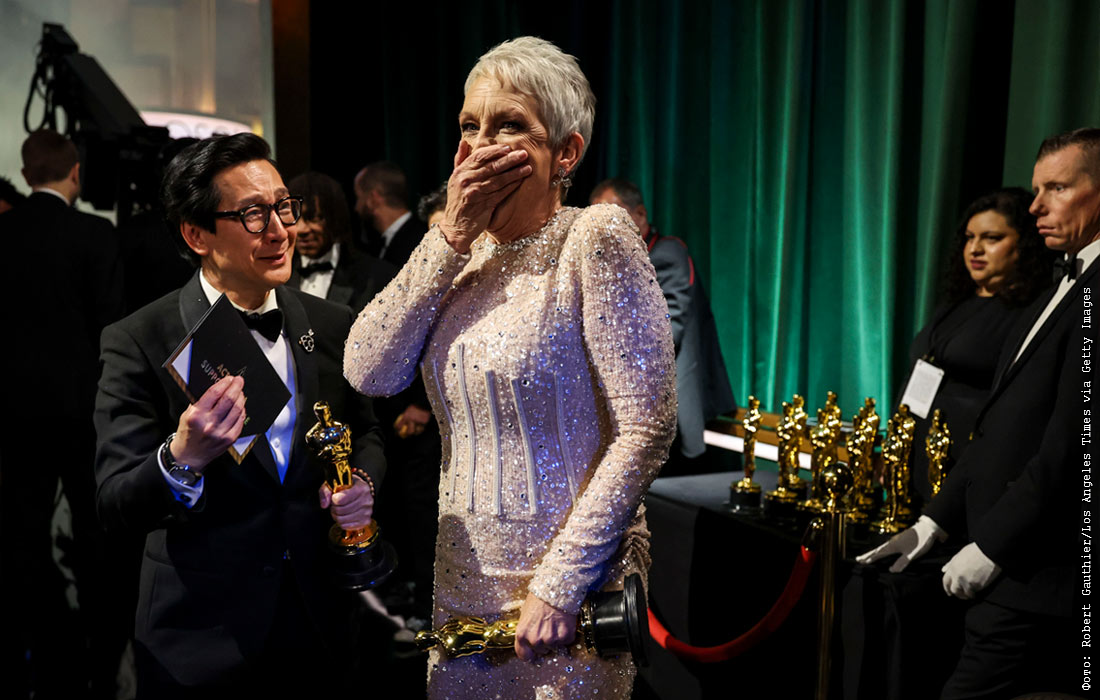 Джейми Ли Кертис, обладательница премии "Лучшая актриса второго плана", и Ке Хюи Куан, обладатель премии "Лучшая мужская роль второго плана", за кулисами