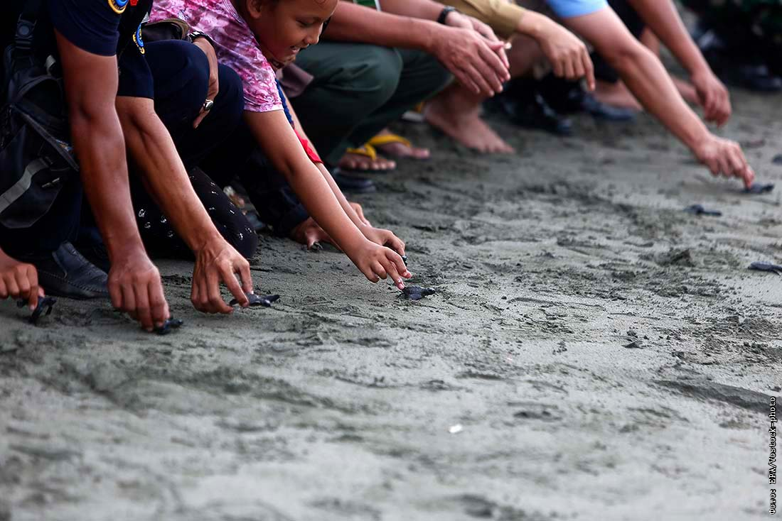 В Индонезии местные жители и активисты снова выпустили в океан детенышей черепах, чтобы восполнить их популяцию