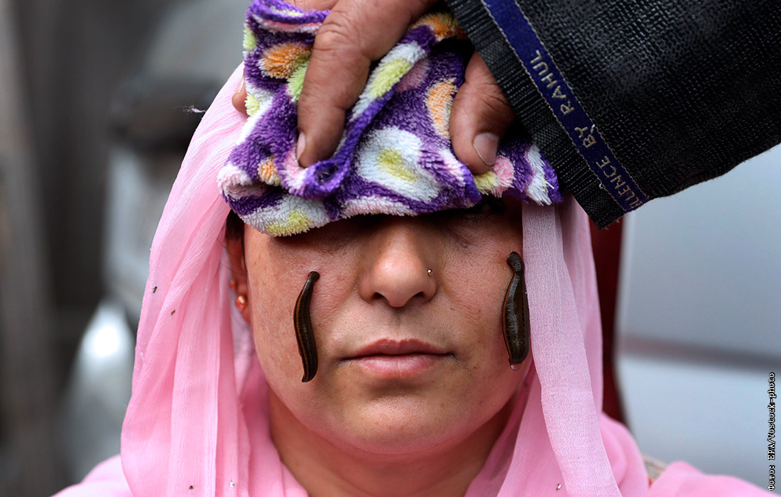 Во время сеанса лечения пиявками на обочине дороги в Сринагаре, Индия
