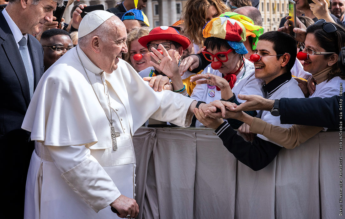 Папа Франциск приветствует группу клоунов в конце своей еженедельной аудиенции в Ватикане