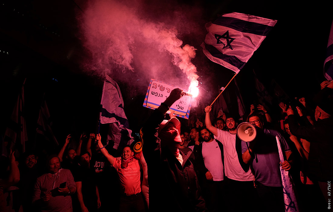 Массовые протесты против судебной реформы продолжаются в Израиле уже 12 недель. В выходные произошли столкновения с полицией, которая начала применять слезоточивый газ и водометы. Общенациональная волна протестов обострилась после увольнения министра обороны Йоава Галланта. Отставка министра была связана с тем, что он призвал правительство остановить процесс принятия закона.