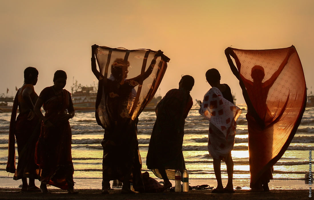 Женщины сушат одежду на пляже в Мумбаи, Индия