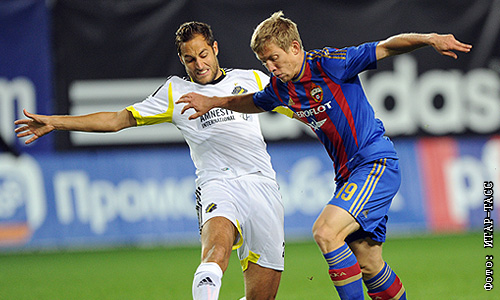 Игрок АИКа Никлас Бакман и армеец Александр Цауня (слева направо) в матче Лиги Европы по футболу: ЦСКА (Москва, Россия) - АИК (Сольна, Швеция).