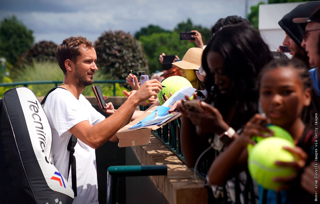 В этом году российские и белорусские теннисисты допущены к участию на теннисном турнире в нейтральном статусе. На фото: теннисист Даниил Медведев раздает автографы болельщикам.