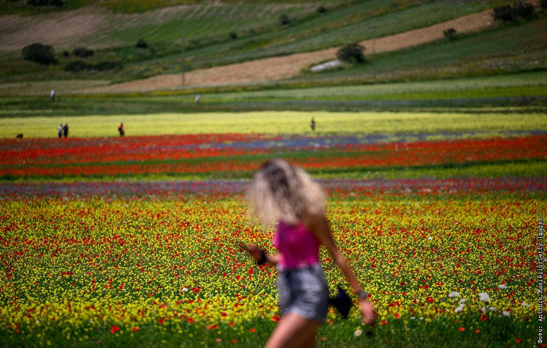 Туристы посещают поля чечевицы и мака во время ежегодного цветения в Кастеллуччо-ди-Норча, Италия.