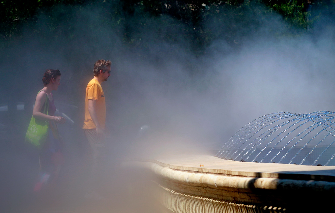 Пара проходит сквозь стену охлаждающего водяного тумана в Бухаресте, Румыния