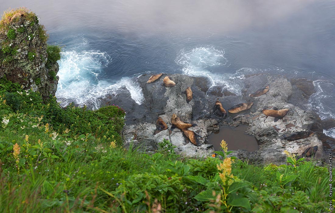 Лежбище сивучей на острове Симушир. Симушир - остров средней группы Большой гряды Курильских островов.