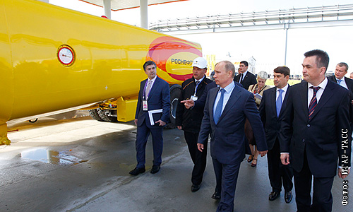 Губернатор Приморского края Владимир Миклушевский, помощник президента РФ Игорь Левитин и Владимир Путин во время посещения топливно-заправочного комплекса компании "Роснефть".
