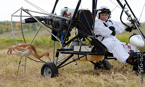 Владимир Путин за штурвалом мотодельтаплана перед полетом на территории орнитологической станции "Кушеват" на Ямале. В. Путин принял участие в научном эксперименте в рамках проекта "Полет надежды" по спасению редкого вида журавлей - стерхов, цель которого - показать выращенным в питомнике птицам маршрут перелета.