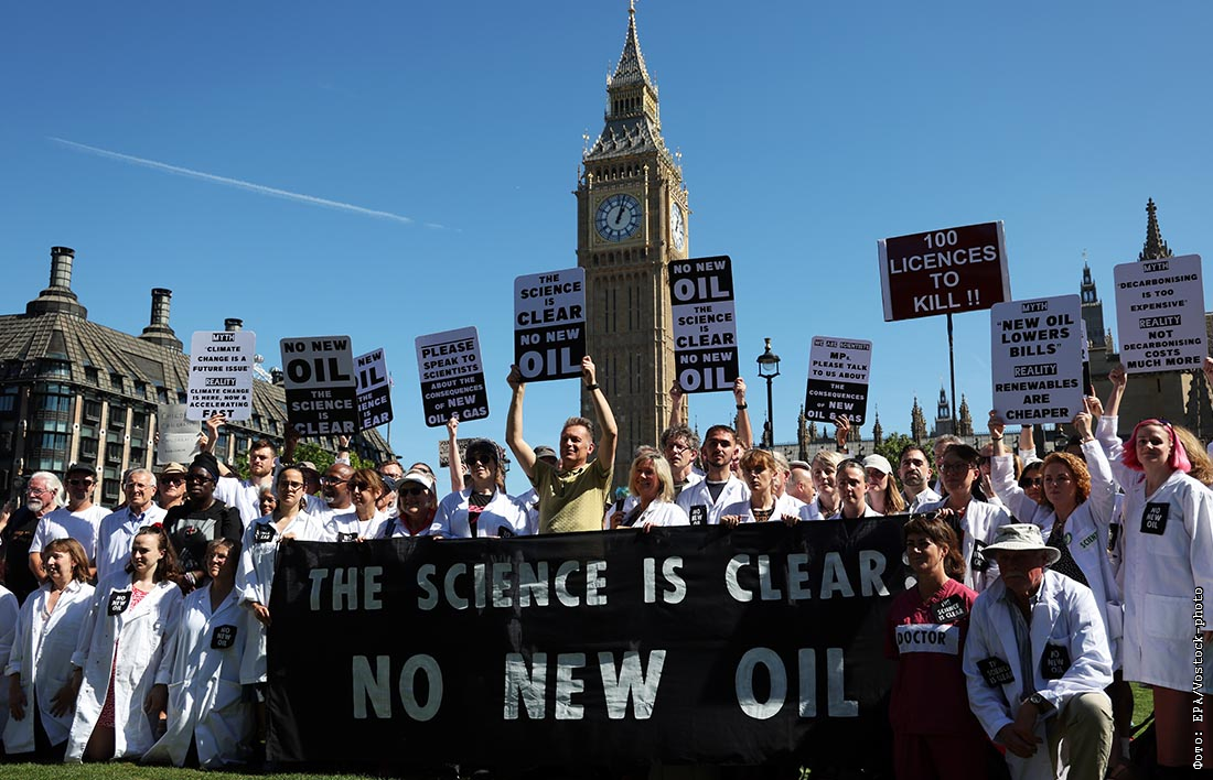 Более сотни ученых провели демонстрацию возле парламента Великобритании, призывая британское правительство не поддерживать новые разработки месторождений нефти и газа