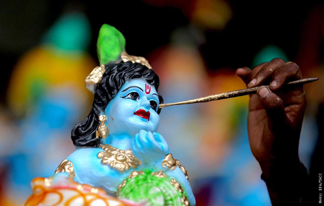 Уличный торговец в Бангалоре в преддверии праздника Джанмаштами, который знаменует рождение индуистского божества Кришны