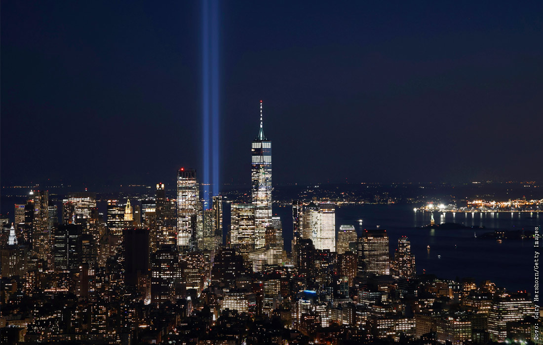 Cветовая инсталляция в память о жертвах терактов 11 сентября 2001 года в Нью-Йорке. Прожекторы, направленные в небо, создают два мощных луча света, похожих на башни-близнецы.