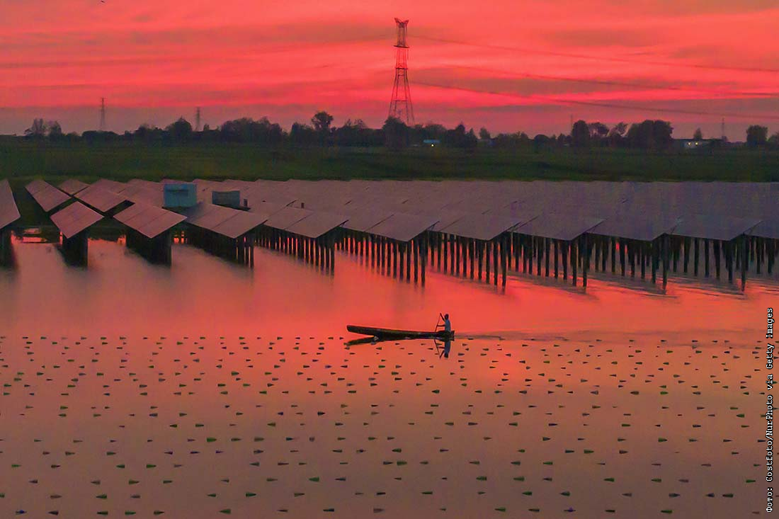 Рабочий на ​​гибридной фотоэлектрической электростанции, в Суцяне, Китай