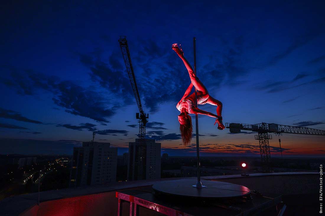 Танцовщица исполняет танец на пилоне на крыше в Берлине