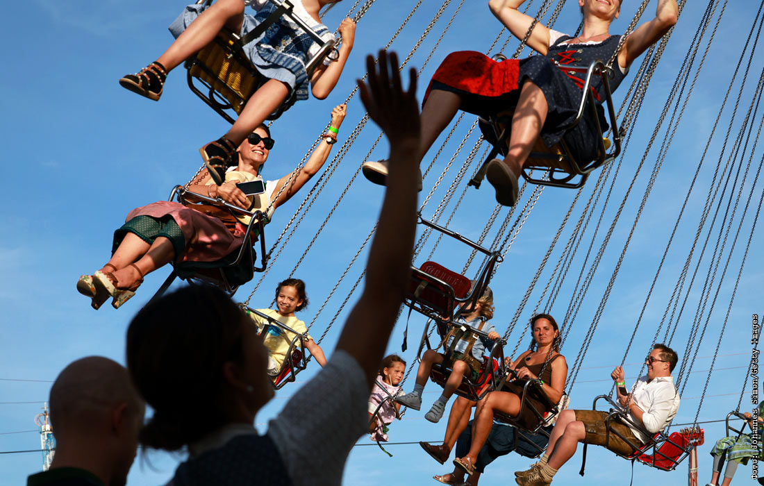 На празднике имеется множество аттракционов - от традиционных каруселей до современных конструкций вроде американских горок