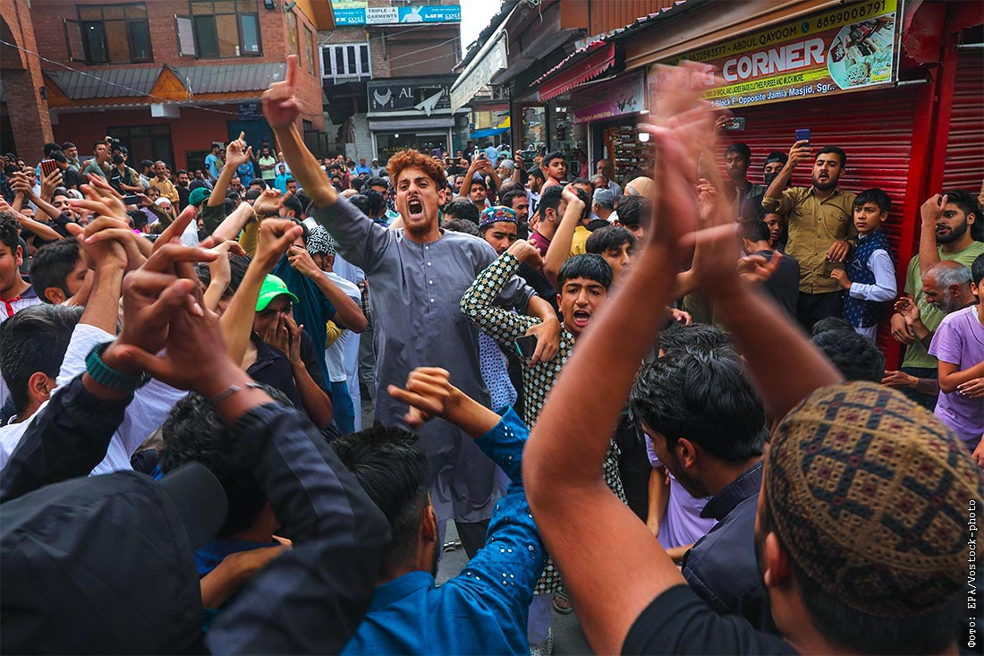 Мирваиз Моулви Умар Фарук, главный имам Кашмира (за кадром), провел пятничную проповедь в мечети Джамия Масджид после четырехлетнего перерыва, вызванного домашним арестом