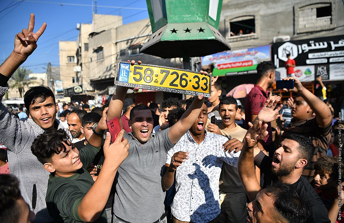 Жители сектора Газа держат номерной знак от израильской военной техники