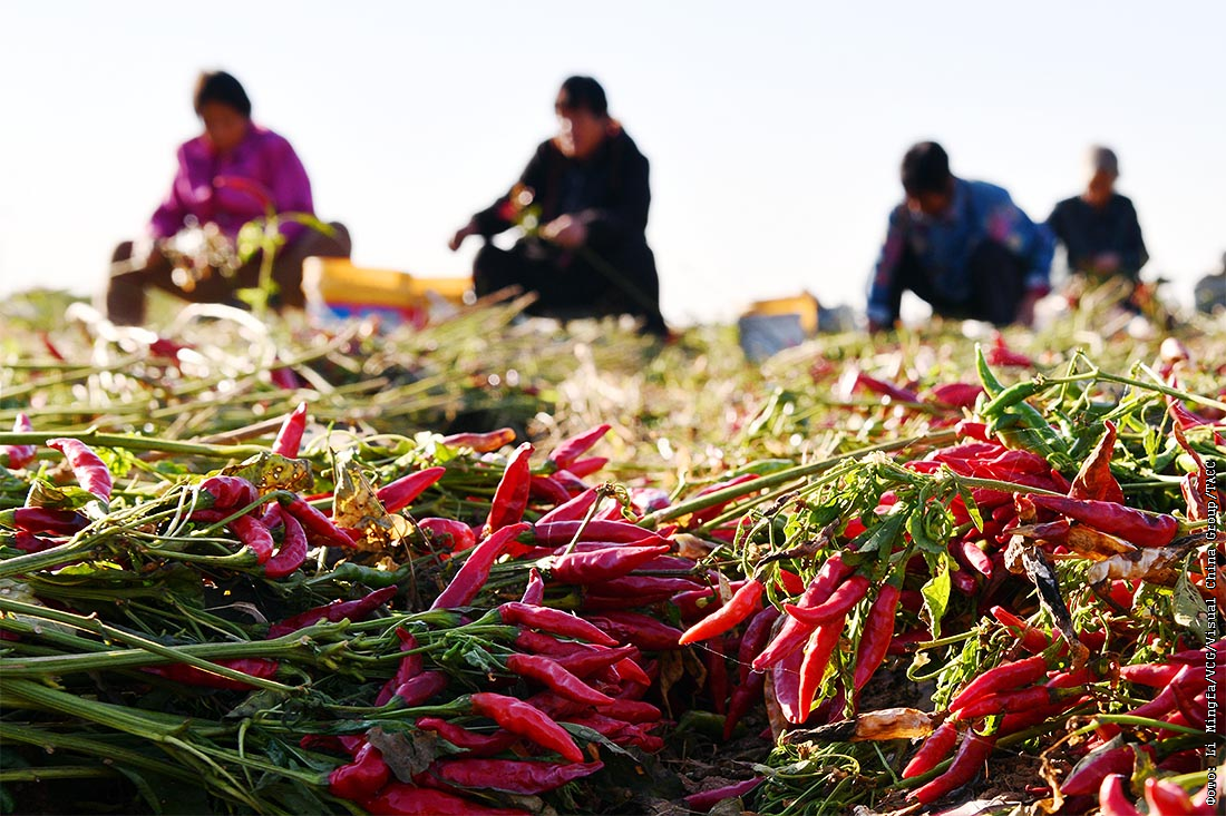 Урожай красного перца чили собирают в китайском Шицзячжуане