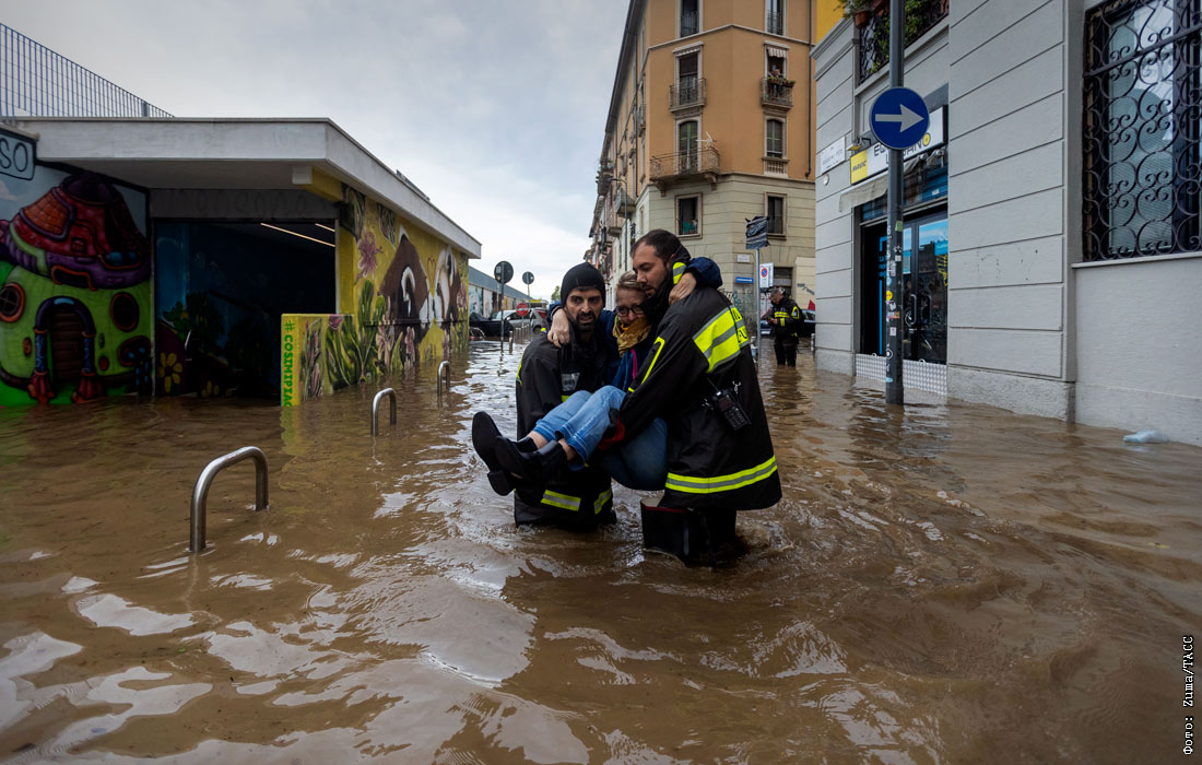 Сильные дожди обрушились на Милан. Из-за разлива реки Севезо северная часть города оказалась затоплена.