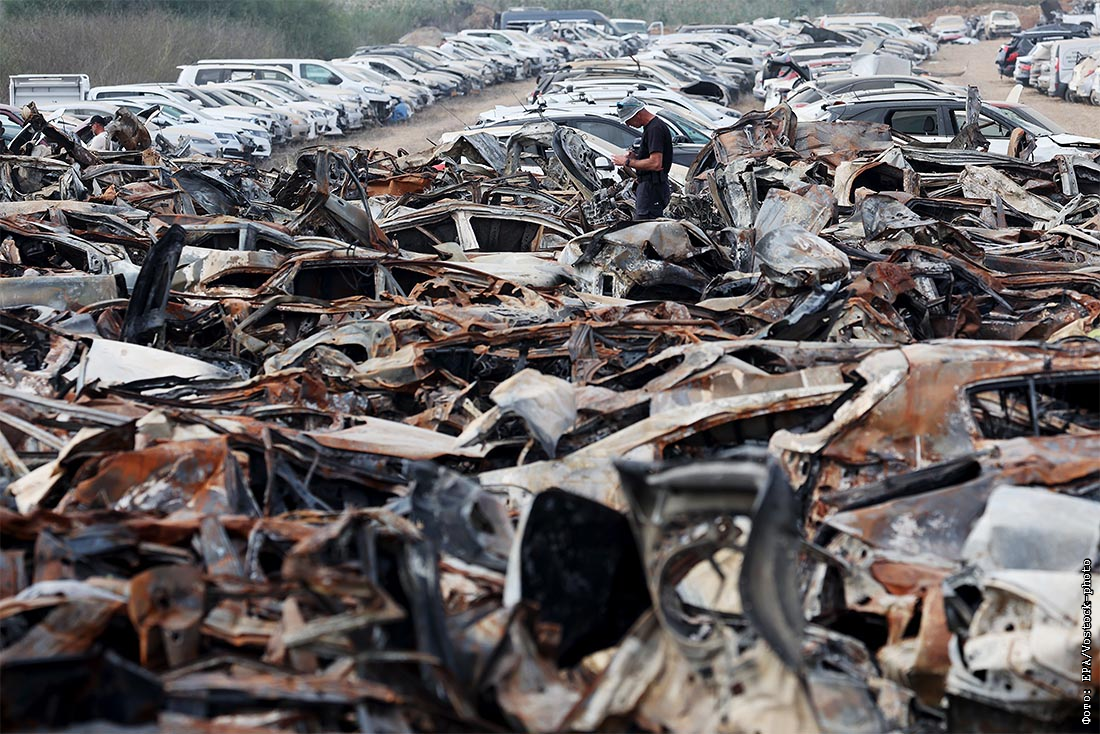 Сотни автомобилей, сгоревших во время нападения ХАМАС, на Израиль собраны в Нетивоте