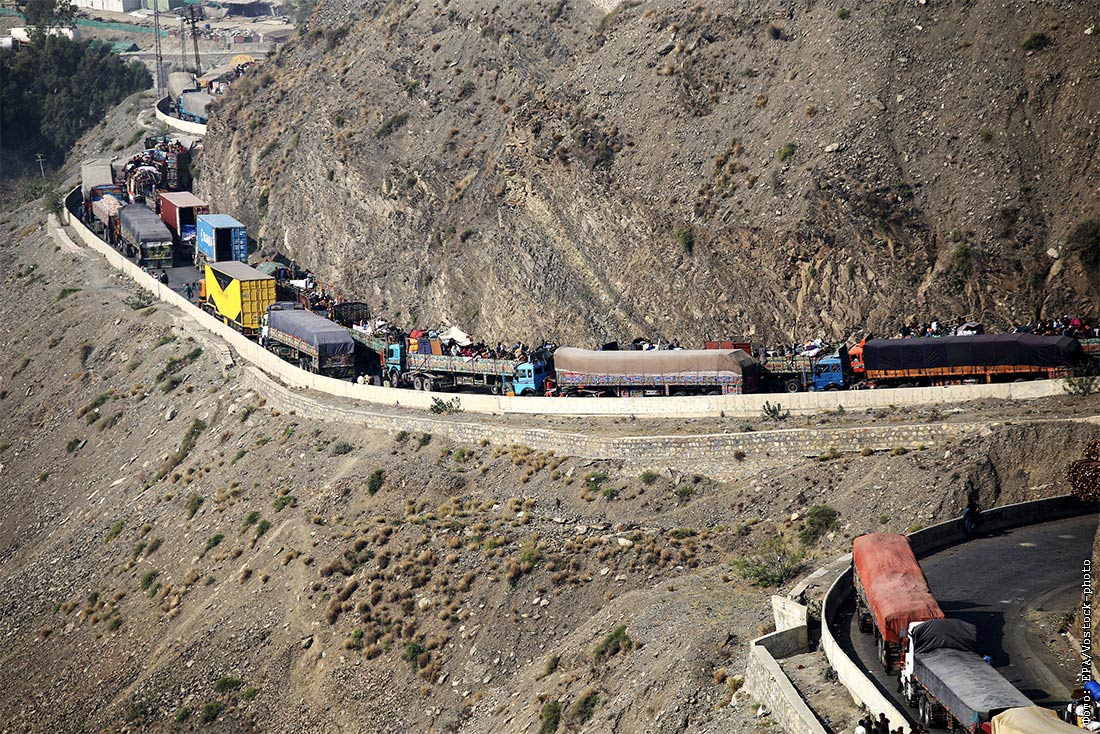 Колонна грузовиков с афганскими беженцами пересекает Хайберский перевал недалеко от границы с Афганистаном