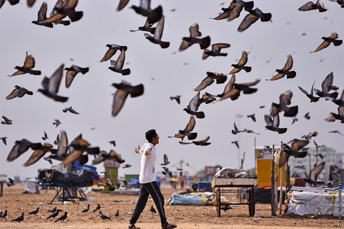 Голуби на пляже Марина в Ченнаи, Индия