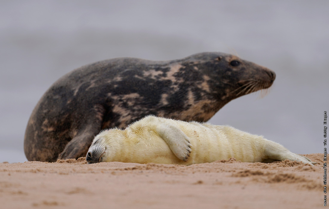 Новорожденный детеныш серого тюленя на пляже в Норфолке, Великобритания