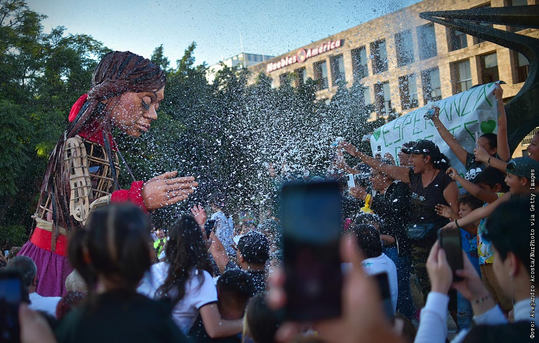 Символизирующая девочку-беженку 3,5-метровая марионетка "Маленькая Амаль" в мексиканском городе Гвадалахара