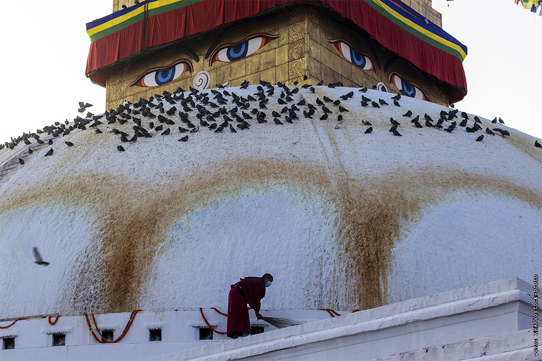 Монах почистил ступу Боднатх в Катманду