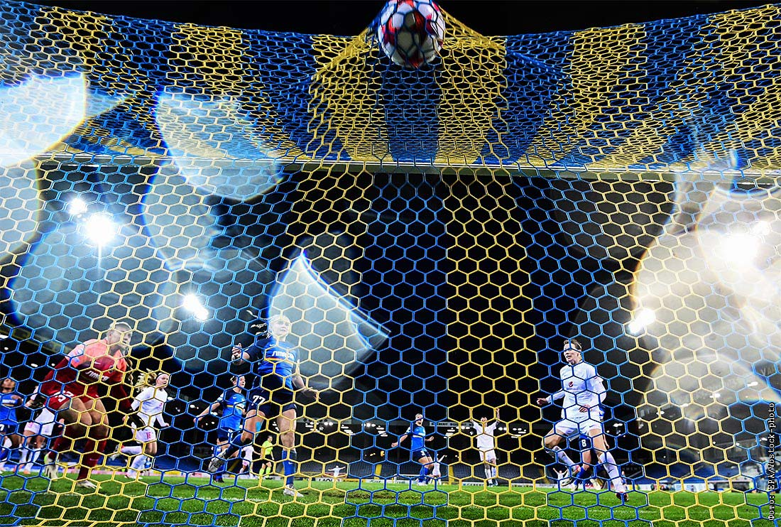 Рэйчел Энгесвик из команды "Бранн" забивает гол во время футбольного матча группы B женской Лиги чемпионов в Австрии