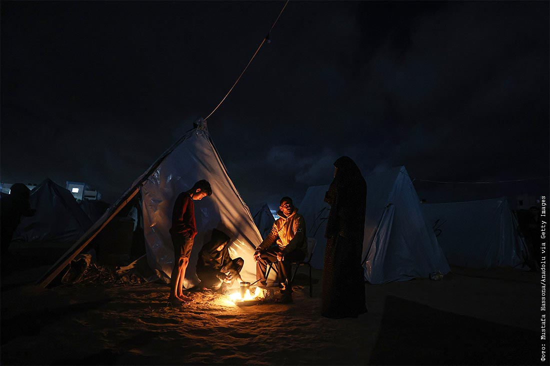 Лишенные домов палестинцы греются у палаток в лагере беженцев в Газе