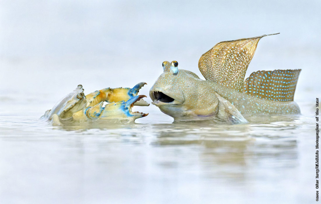 Илистый прыгун защищает свою территорию от краба в бухте Робак, Австралия