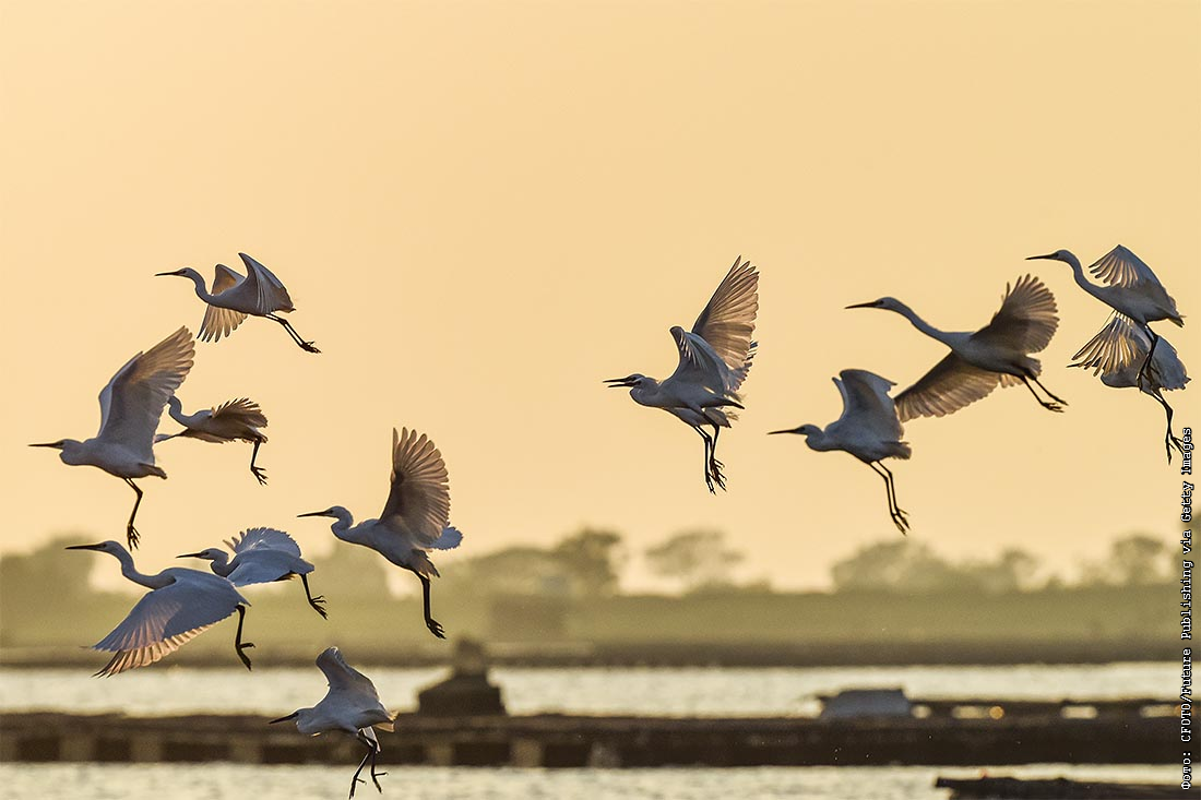 Цапли на закате на мелководье в устье Наньлюцзян в городе Бэйхай в Китае