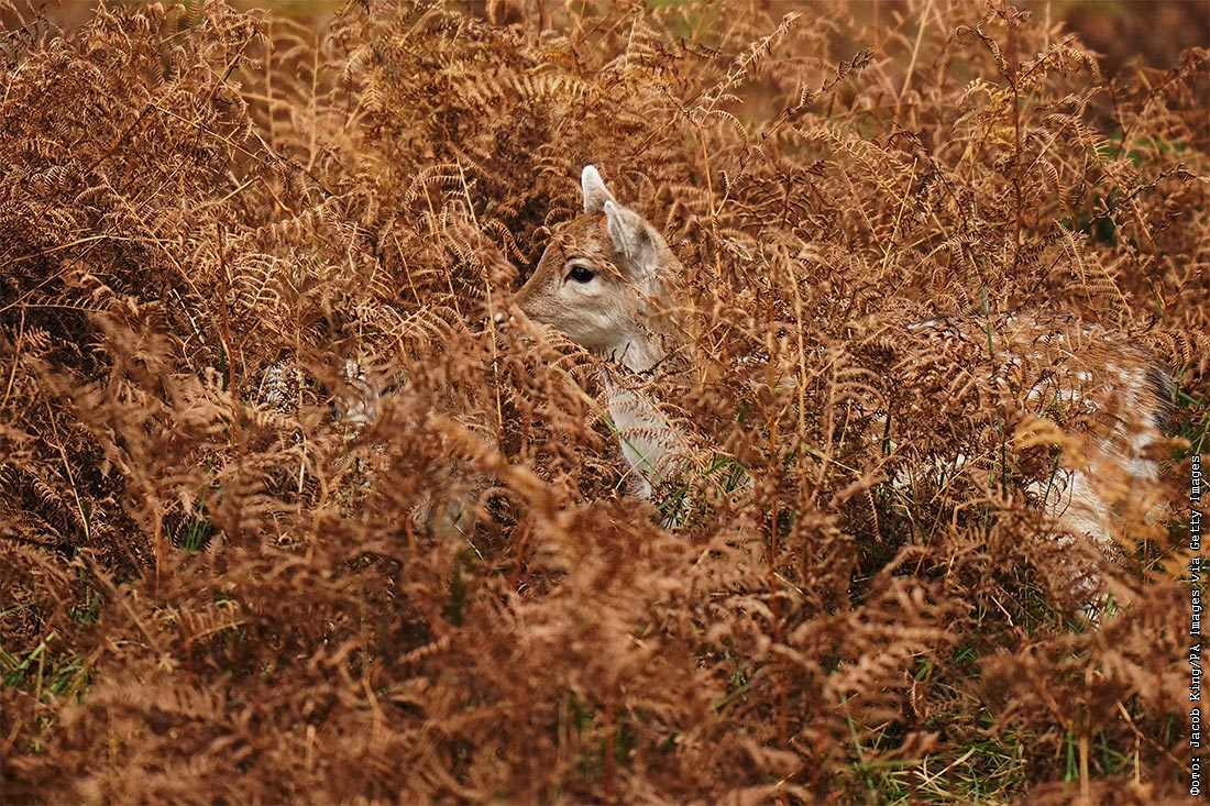 Лань в осенней листве в парке Брэдгейт в Лестершире