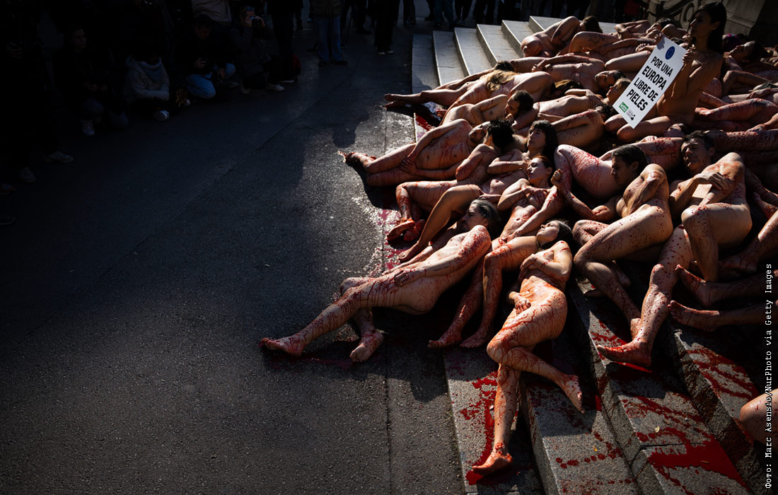 Активисты из группы зоозащитников AnimaNaturalis устроили акцию против торговли мехом в Барселоне
