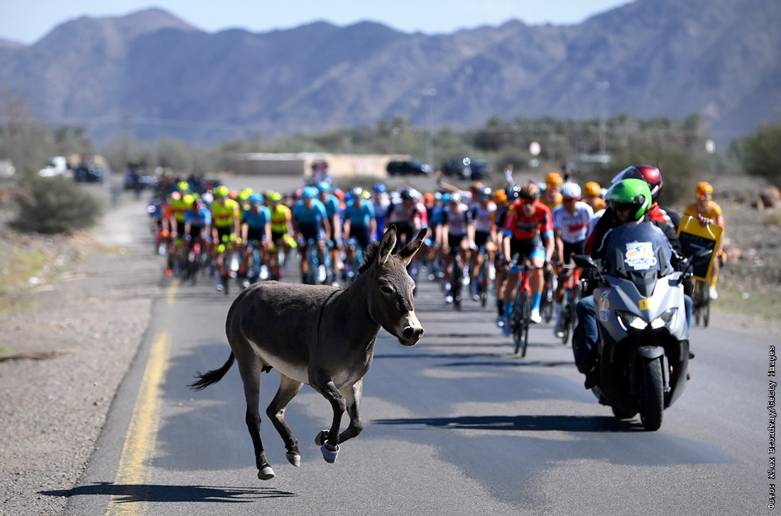 Осел перебегает дорогу во время велогонки "Тур Саудовской Аравии"