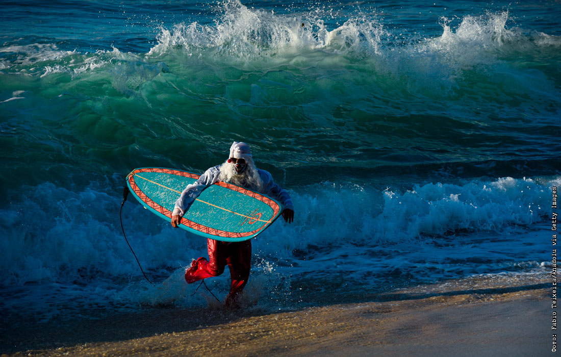 Серфер в костюме Санта-Клауса на пляже в Рио-де-Жанейро