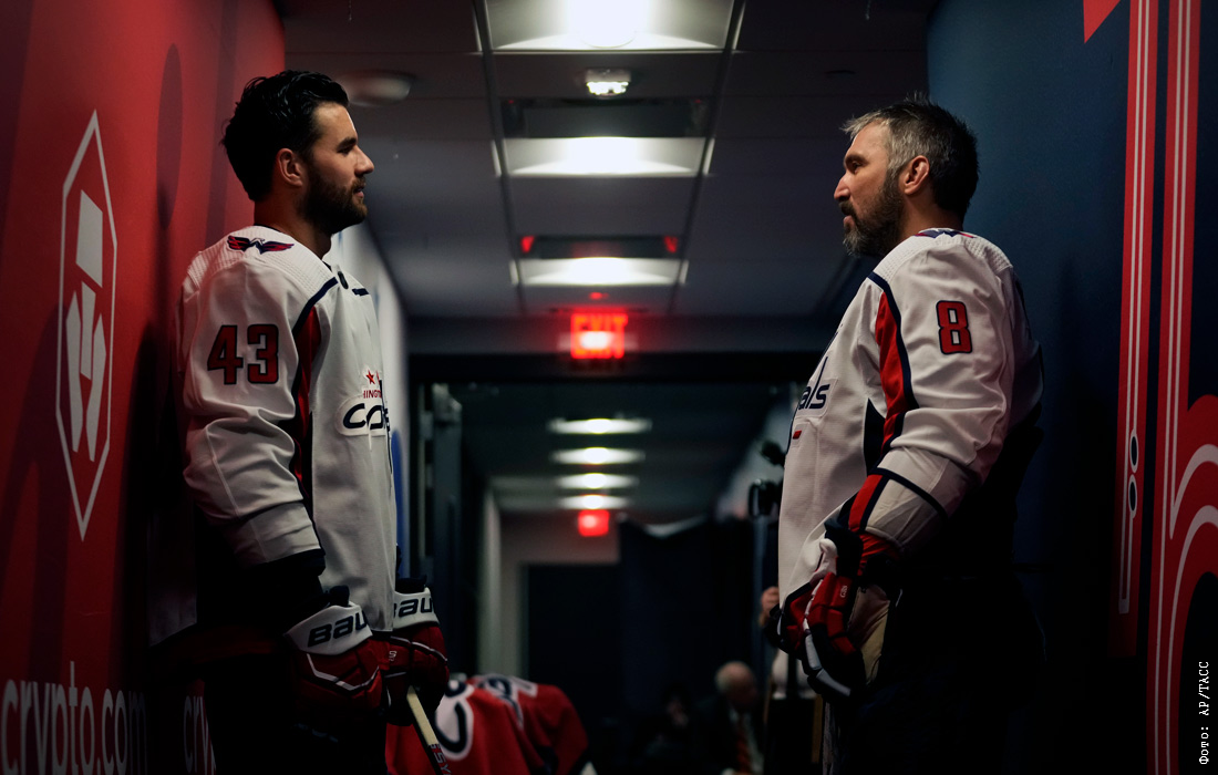 Игроки "Вашингтон Кэпиталз" Том Уилсон и Александр Овечкин перед хоккейным матчем НХЛ против "Филадельфии Флайерз"