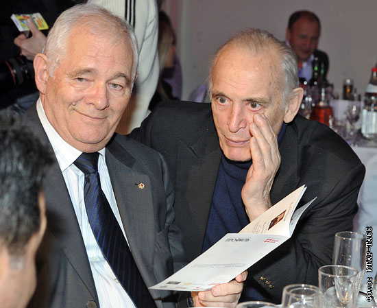 Директор НИИ неотложной детской хирургии и травматологии Леонид Рошаль и актер Василий Лановой (слева направо) на благотворительном гала-приеме "Звезды мира - детям России" в киноконцертном зале "Москва"