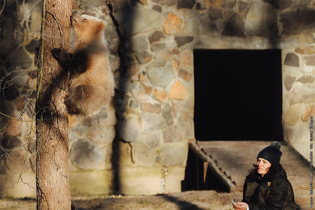 Медвежонок, сидевший на дереве в Кошицком зоопарке в Словакии с середины декабря прошлого года, решил наконец-то спуститься и поесть