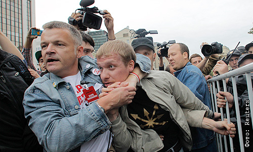 Организаторы акции оппозиции в Москве просят полицию вывести с огороженной территории активистов "Евразийского союза молодежи". Как передает корреспондент "Интерфакса", мужчина, на груди которого бейдж "Организатор" и белая лента, обратился к дежурящим у рамок полицейским с просьбой вывести за огороженную территорию активиста "Евразийского союза молодежи", который развернул плакат "Миллионы вас, нас тьмы, и тьмы, и тьмы".