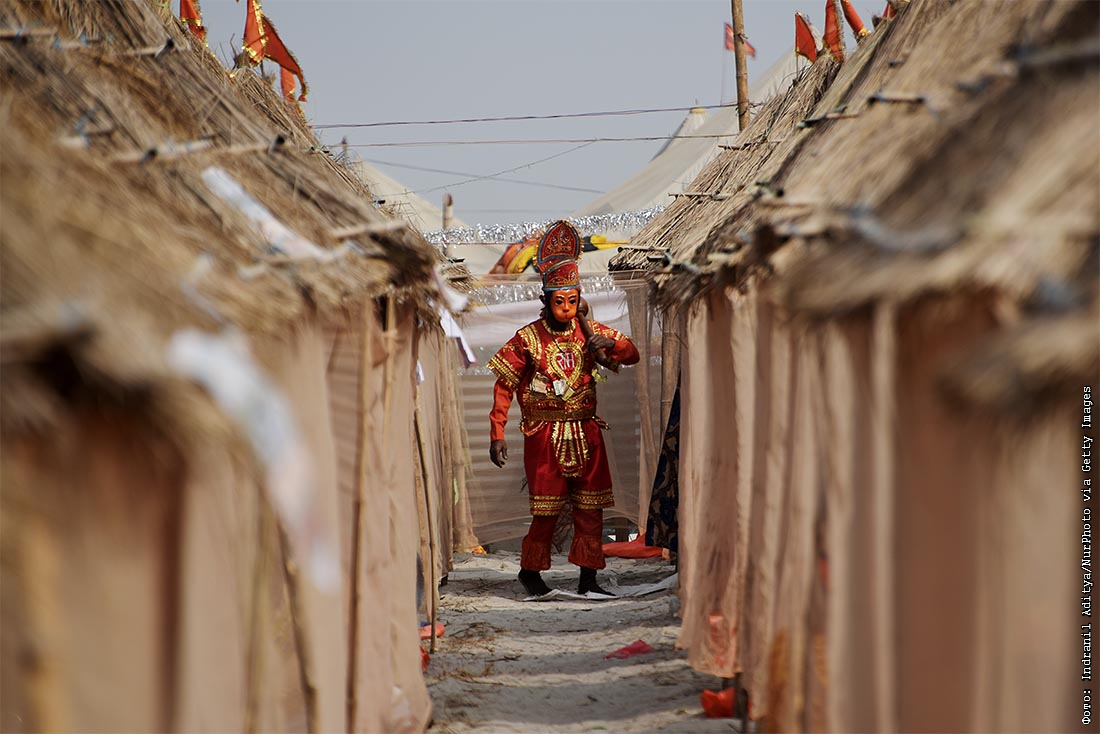 Мужчина, одетый как Господь Хануман, танцует под песни Рам-бхаджанов в палаточном городке в Уттар-Прадеш, Индия