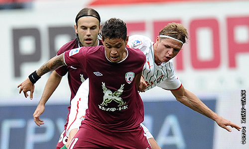 Игроки "Рубина" Карлос Эдуардо (на первом плане), Бибрас Натхо (на третьем плане) и "Локомотива" Дмитрий Тарасов (на втором плане) в матче чемпионата России по футболу: "Локомотив" (Москва) - "Рубин" (Казань).