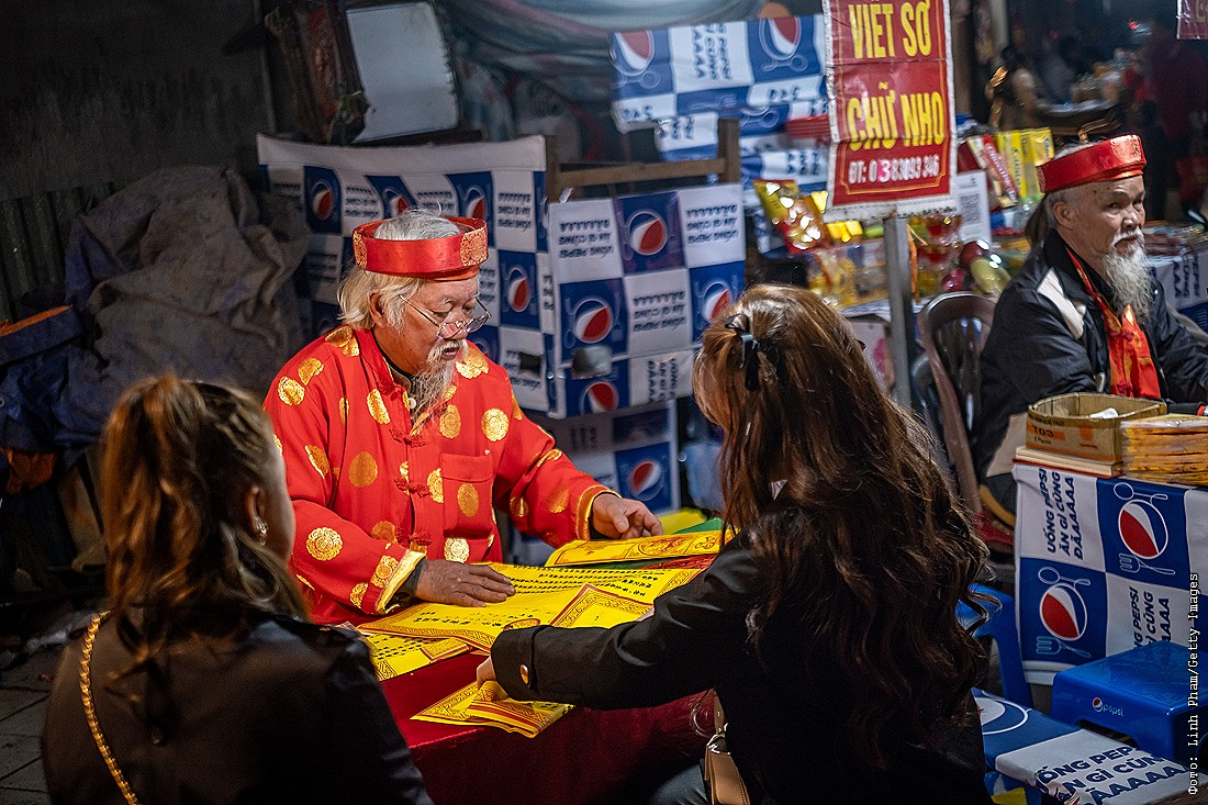 Каллиграф записывает пожелания посетителей фестиваля в честь Нового года по Лунному календарю в Ханое, Вьетнам
