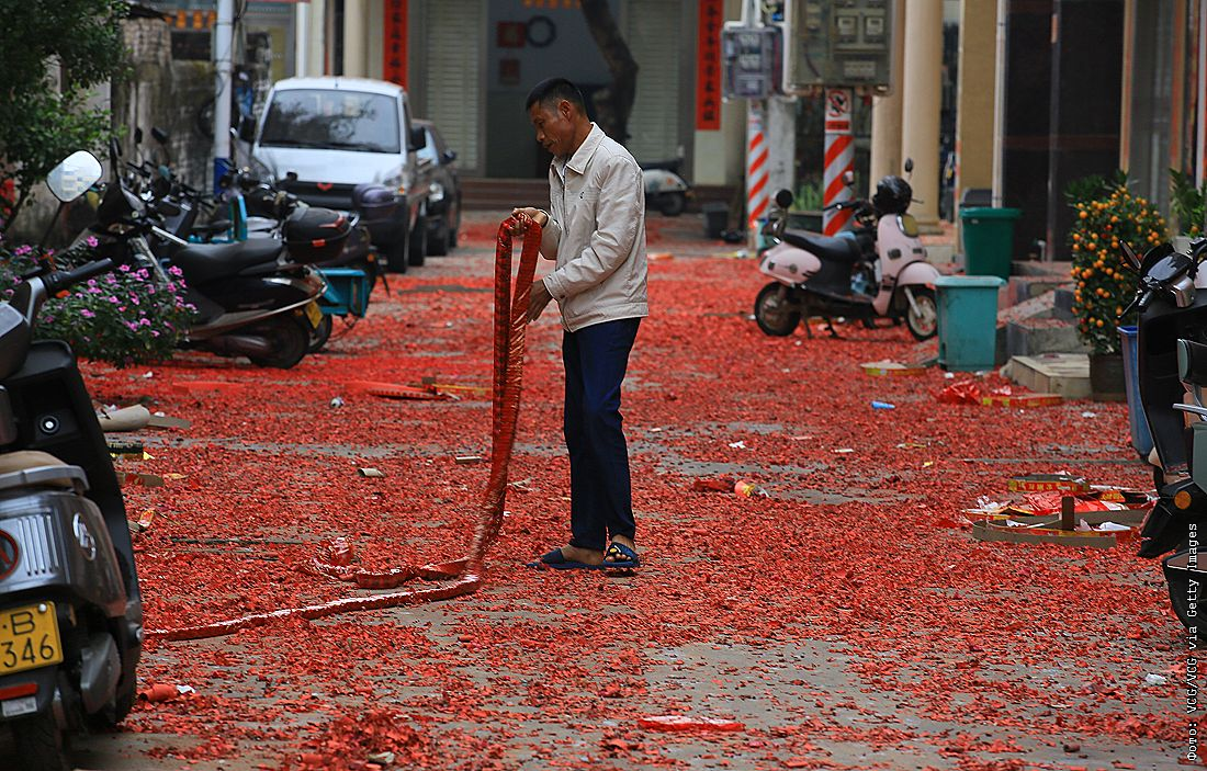 Уборка улицы после встречи Нового года по Лунному календарю в городе Санья, Хайнань, Китай
