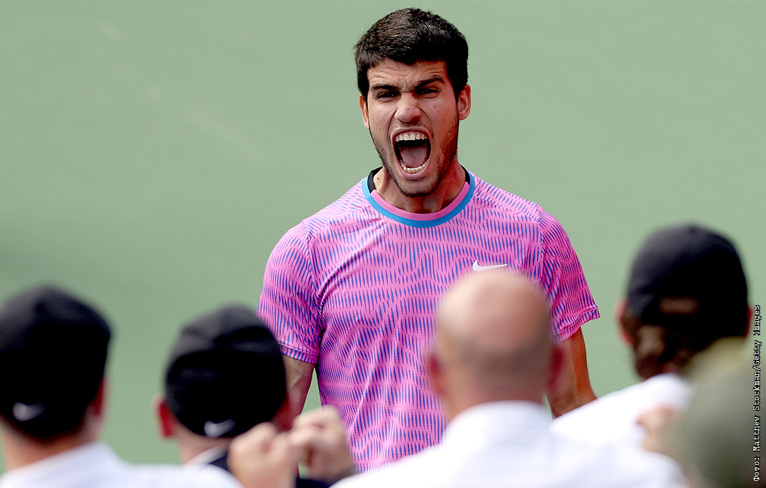 Карлос Алькарас из Испании празднует победу после победы над Даниилом Медведевым во время мужского финала теннисного турнира BNP Paribas Open, Индиан-Уэллс, Калифорния