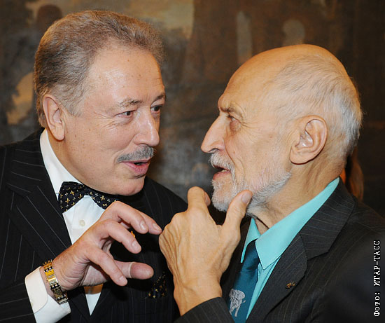 Музыковед Станислав Бэлза и телеведущий Николай Дроздов (слева направо) на выставке картины Рафаэля "Дама с единорогом" в посольстве Италии, открывающей Год итальянской культуры и итальянского языка в России