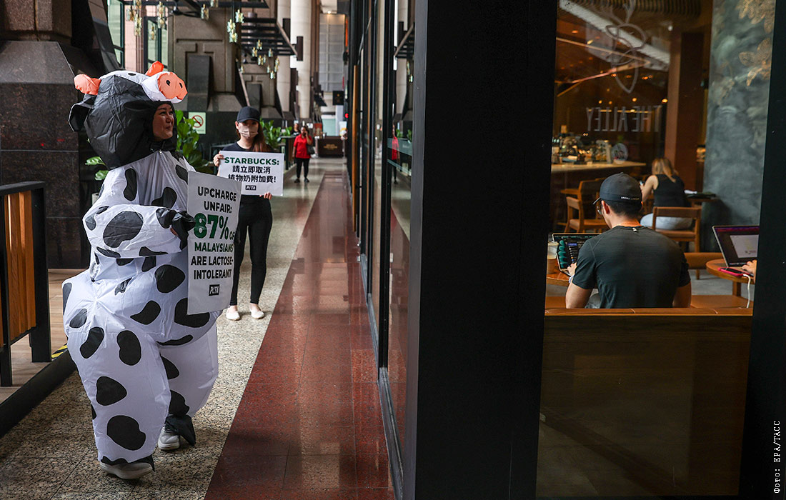 Активисты за этичное обращение с животными около кофейни Starbucks в Куала-Лумпуре