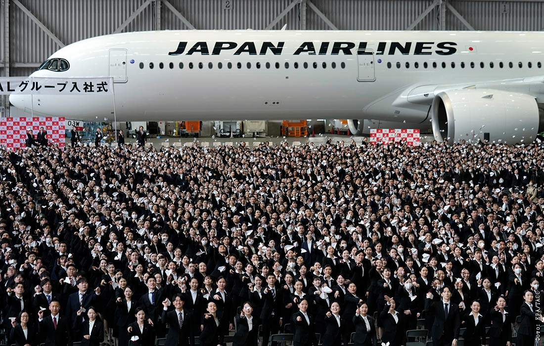 Церемония приветствия новых сотрудников авиакомпании Japan Airlines в аэропорту Токио