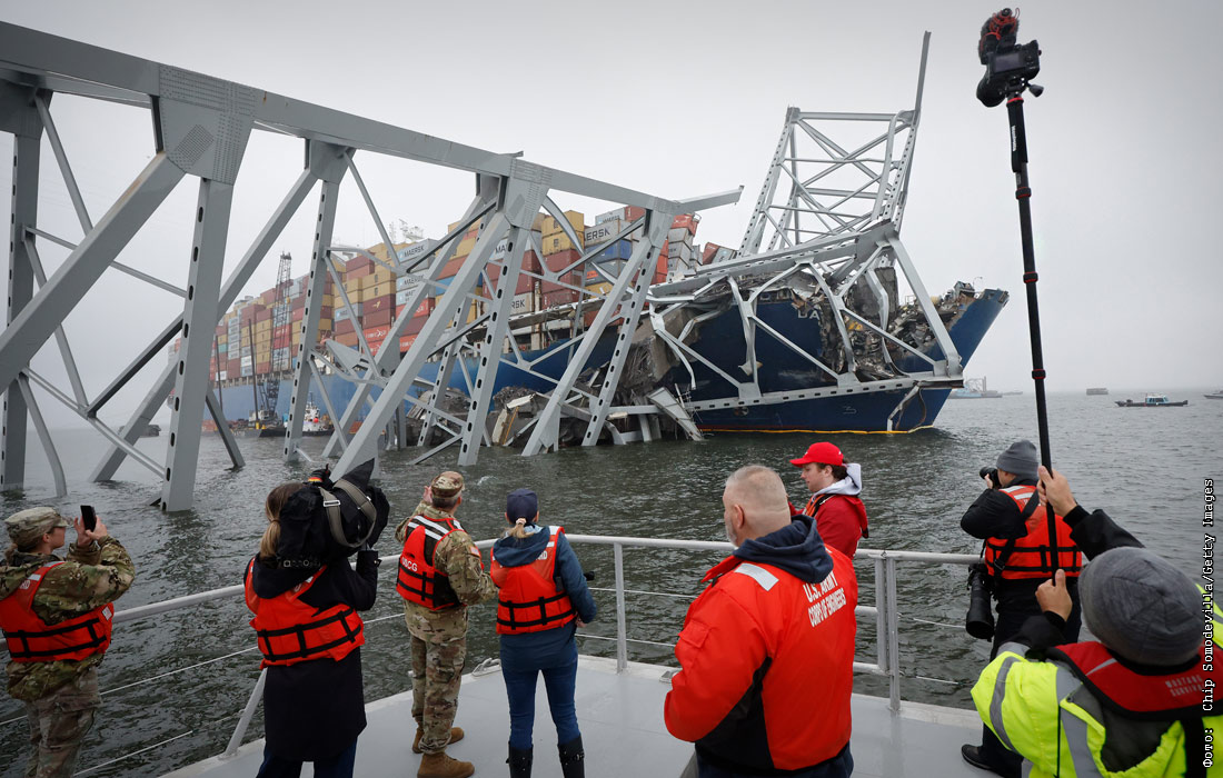 Вид на контейнеровоз Dali, который врезался в опору моста Фрэнсиса Скотта Ки в Балтиморе